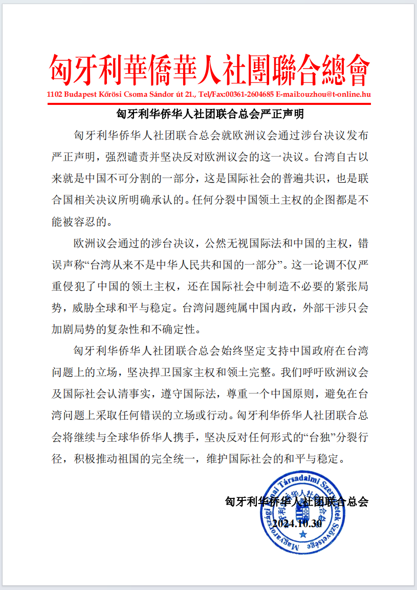 匈牙利华侨华人社团联合总会始终坚定支持中国政府在台湾问题上的立场,坚决捍卫国家主权和领土完整。我们呼吁欧洲议会及国际社会认清事实,遵守国际法,尊重一个中国原则,避免在台湾问题上采取任何错误的立场或行动。匈牙利华侨华人社团联合总会将继续与全球华侨华人携手,坚决反对任何形式的“台独”分裂行径,积极推动祖国的完全统一,维护国际社会的和平与稳定。