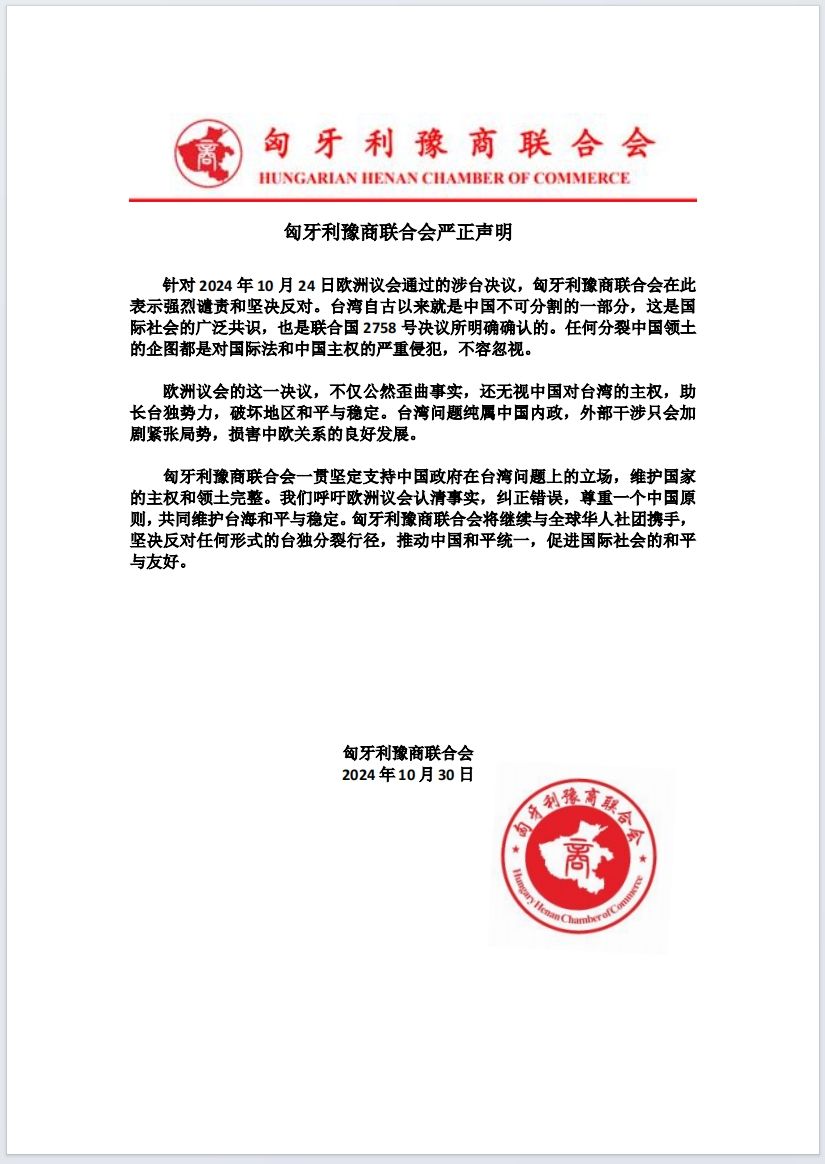 针对2024年10月24日欧洲议会通过的涉台决议,匈牙利豫商联合会在此表示强烈谴责和坚决反对。台湾自古以来就是中国不可分割的一部分,这是国际社会的广泛共识,也是联合国2758号决议所明确确认的。任何分裂中国领土的企图都是对国际法和中国主权的严重侵犯,不容忽视。
