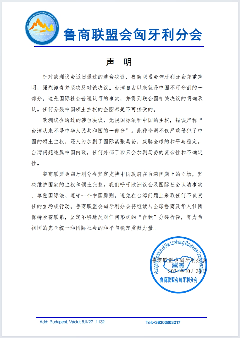 鲁商联盟会匈牙利分会坚定支持中国政府在台湾问题上的立场,坚决维护国家的主权和领土完整。我们呼吁欧洲议会及国际社会认清事实、尊重国际法、遵守一个中国原则,避免在台湾问题上采取任何不负责任的立场或行动。鲁商联盟会匈牙利分会将继续与全球鲁商及华人社团保持紧密联系,坚定不移地反对任何形式的“台独”分裂行径,努力为祖国的完全统一和国际社会的和平与稳定贡献力量。
