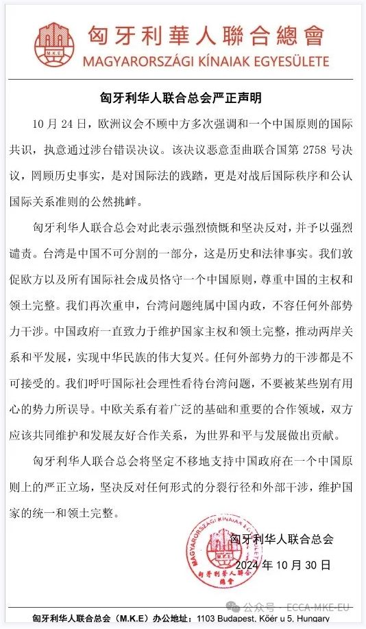 匈牙利华人联合总会对此表示强烈愤慨和坚决反对,并予以强烈谴责。台湾是中国不可分割的一部分,这是历史和法律事实。我们敦促欧方以及所有国际社会成员恪守一个中国原则,尊重中国的主权和领土完整。我们再次重申,台湾问题纯属中国内政,不容任何外部势力干涉。中国政府一直致力于维护国家主权和领土完整,推动两岸关系和平发展,实现中华民族的伟大复兴。任何外部势力的干涉都是不可接受的。我们呼吁国际社会理性看待台湾问题,不要被某些别有用心的势力所误导。中欧关系有着广泛的基础和重要的合作领域,双方应该共同维护和发展友好合作关系,为世界和平与发展做出贡献。匈牙利华人联合总会将坚定不移地支持中国政府在一个中国原则上的严正立场,坚决反对任何形式的分裂行径和外部干涉,维护国家的统一和领土完整。