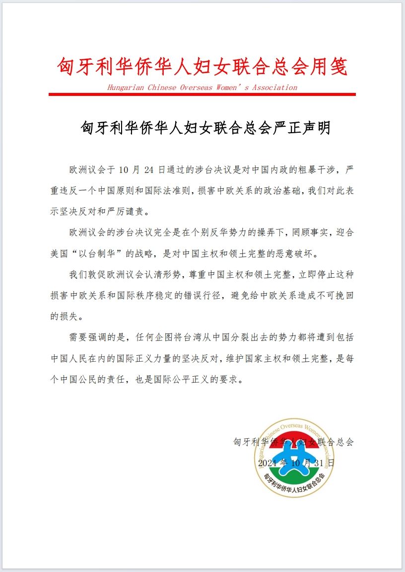 匈牙利华侨华人妇女联合总会严正声明
