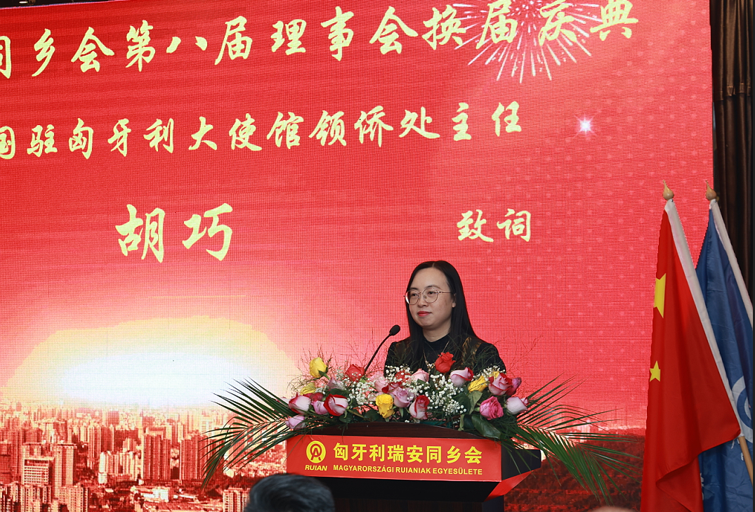 中国驻匈牙利大使馆领侨处胡巧主任宣读了中国驻匈使馆的贺函。(全文另发)