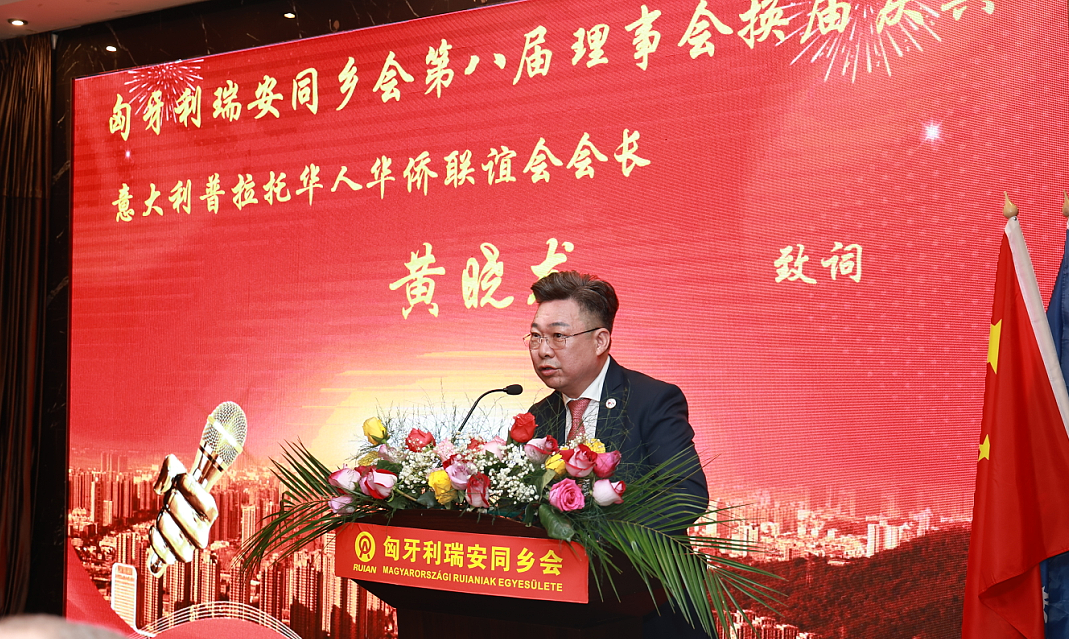 从远道专程而来的意大利普拉托华人华侨联谊会会长黄晓龙,也在会上发表了热情洋溢的贺辞。