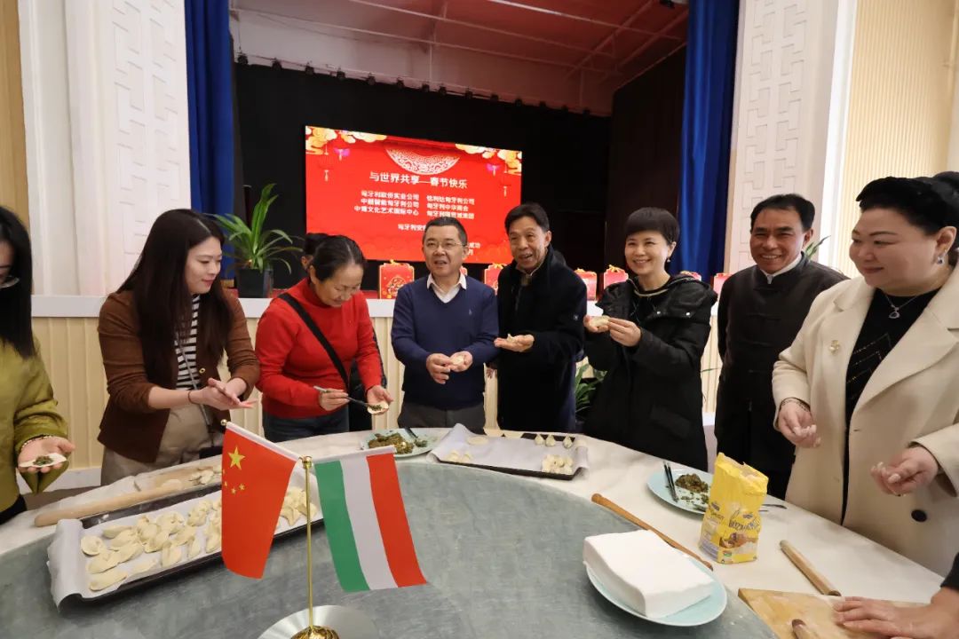 龚大使还在欧侨文化中心内与大家一起包饺子、品年味儿,欢聚一堂庆祝“中国春节”申遗成功,并为在场的匈牙利欧侨实业有限公司、匈牙利铭利达公司、中舰匈牙利公司、匈牙利国贸城集团、匈牙利中华商会、中博国际文化交流中心、匈牙利安徽商会等企业及华侨、华人和企业员工送上新春礼包及新年祝福。