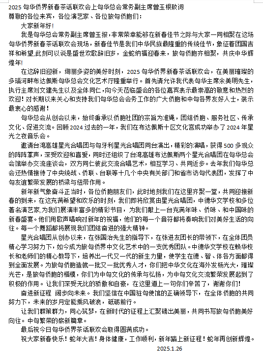 借此新年茶话联欢机会,我谨代表匈牙利统促会对多年来支持帮助我会工作侨团和华商表示感谢和新春祝福,恭祝大家蛇年事事顺利,喜事连连。