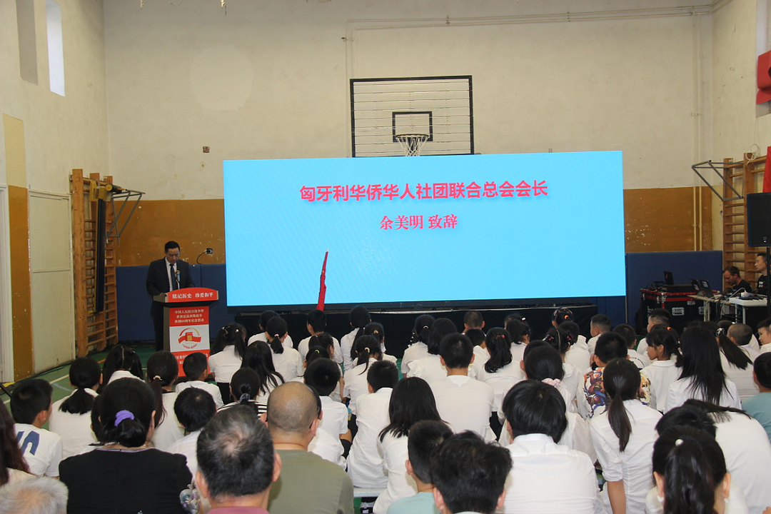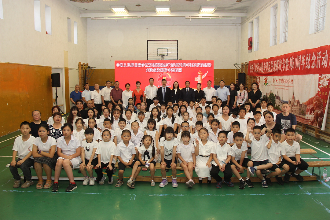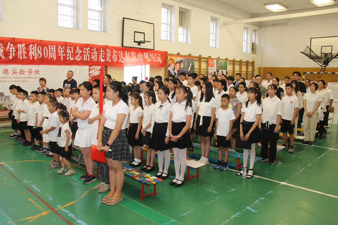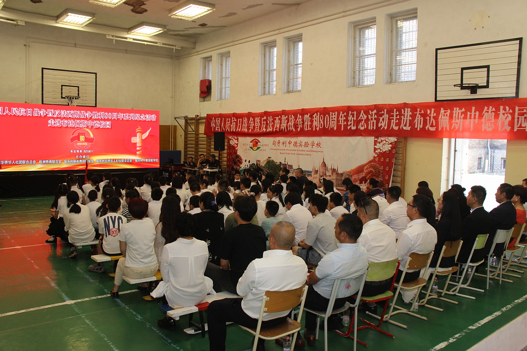 匈牙利《欧洲论坛报》8月12日报道,8月11日由匈牙利华侨华人社团联合总会、欧洲侨商联合会、匈牙利丽水青田同乡会、匈牙利华侨华人妇女联合总会、匈牙利中德实验学校共同举办的匈牙利侨界纪念抗日战争暨反法西斯战争胜利80周年系列纪念活动走进布达佩斯中德校园活动在该校礼堂隆重举行。中国驻匈牙利大使馆领侨处领事:朱晓宇、汪恺妮;匈华总会主席余美明,匈华总会执行主席、匈牙利福建商会会长刘文建,匈华总会副主席谢伟麟;欧洲侨商联合会执行会长黄玉华、秘书长王志梅;匈牙利丽水青田同乡会秘书长范巧雄,常务副会长刘国勇;匈牙利华人联合总会会长张永伟、匈华妇联总会常务副会长薛微微,中德实验学校师生120多人参加活动。