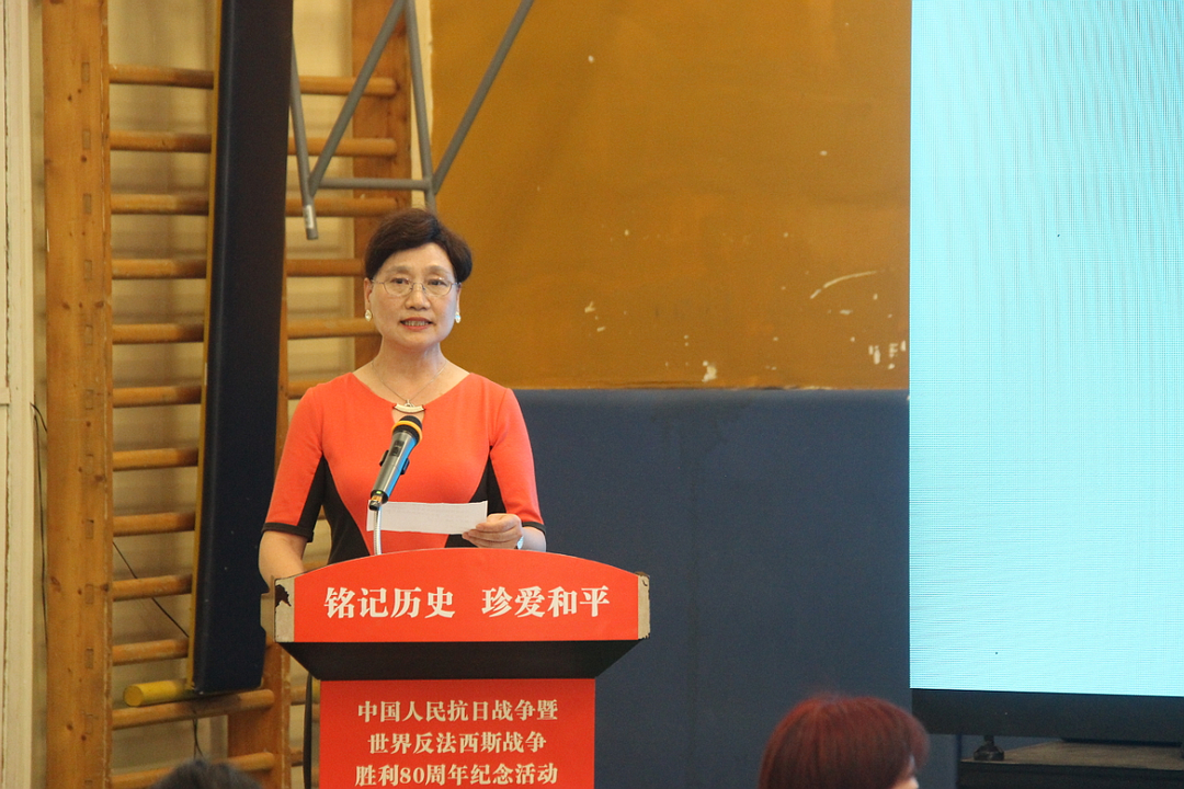 匈华妇联总会常务副会长薛微微发言。他说,今天我们通过观看历史影像和图片,重温了那段硝烟弥漫、波澜壮阔的抗战岁月,缅怀了为民族独立与世界和平英勇牺牲的先烈。这不仅是一次历史的回顾,更是一次心灵的洗礼。希望在场的同学们能够铭记历史、珍爱和平,把爱国热情转化为勤奋学习、积极进取的动力,努力掌握知识和本领,为将来建设祖国、服务社会贡献力量。同时也希望大家将所学所感传递给身边的朋友和家人,让铭记历史、捍卫和平成为我们共同的信念与行动。