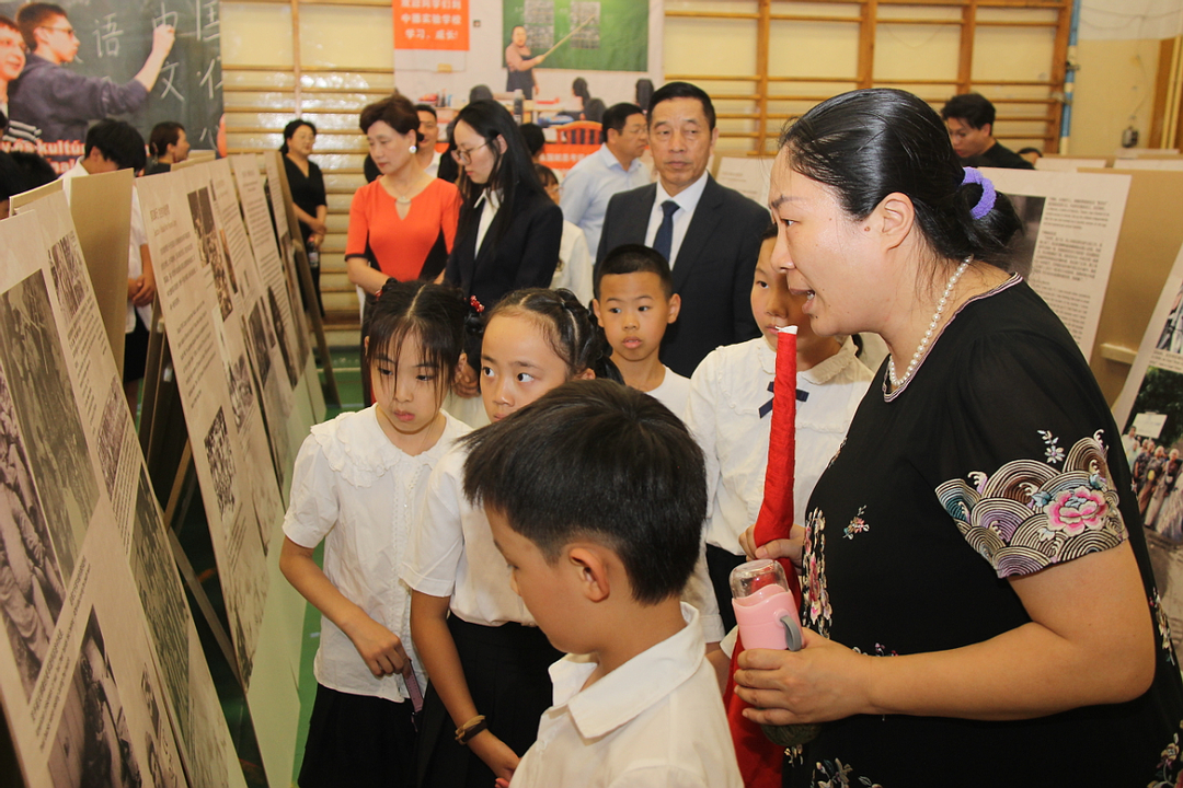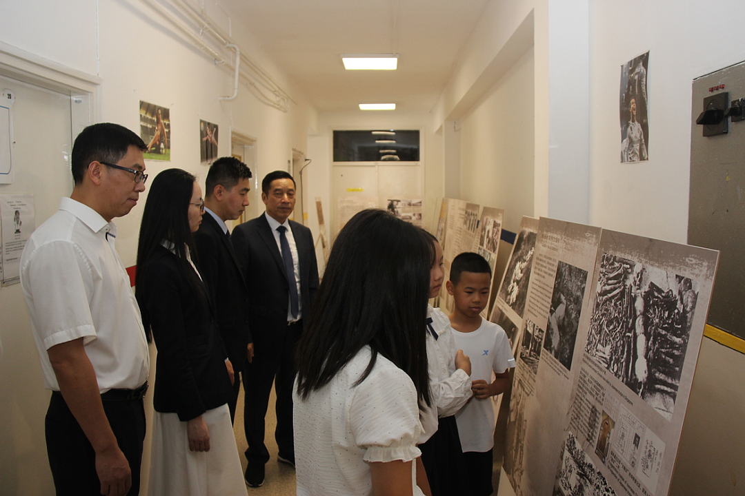中国驻匈使馆领侨处领事朱晓宇、汪恺妮;匈华总会主席余美明等侨领和中德实验学校师生参观″铭记历史 珍爱和平″图片展。