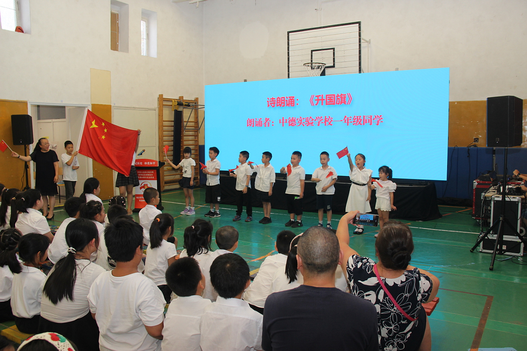 中德实验学校一年级学生表演诗朗诵:《升国旗》。