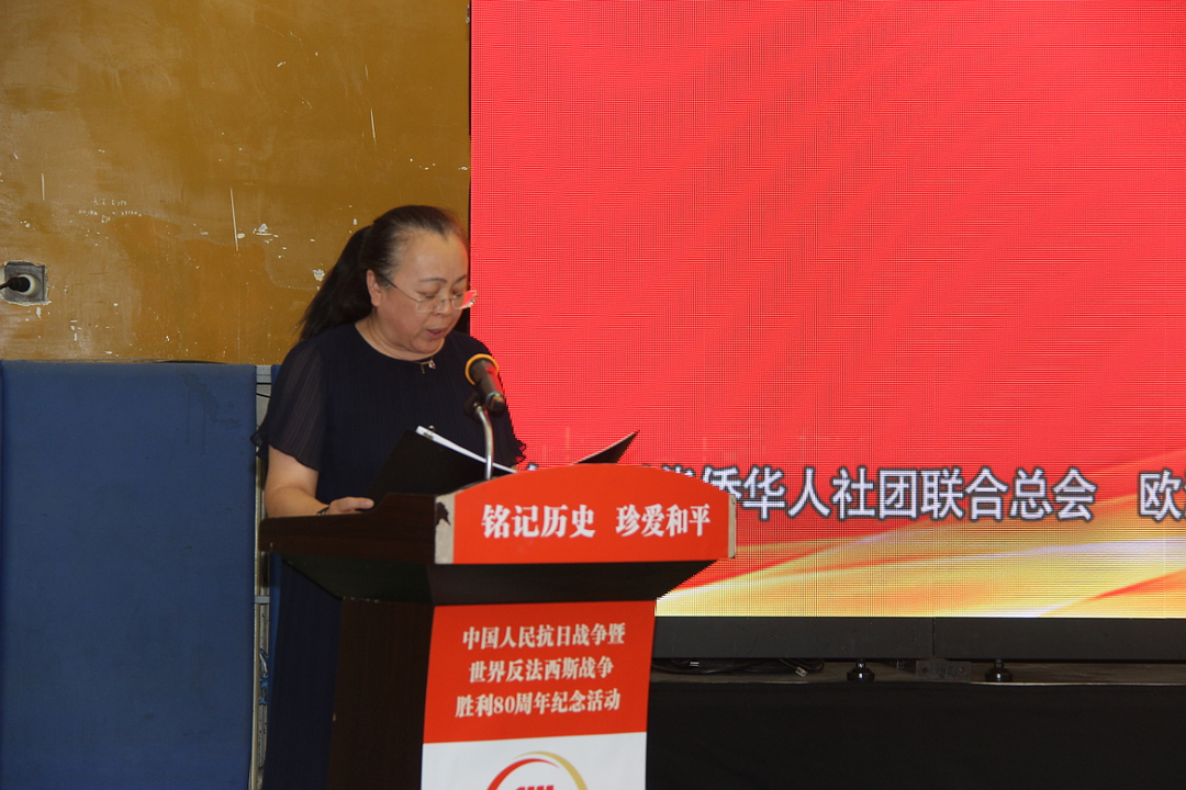 欧洲侨商联合会秘书长王志梅发言。她说,今天,我们齐聚在布达佩斯中德实验学校,共同参加“纪念中国人民抗日战争暨世界反法西斯战争胜利80周年”活动。这不仅是一次缅怀历史、铭记先烈的庄严聚会,更是一堂生动而深刻的爱国主义教育课。
