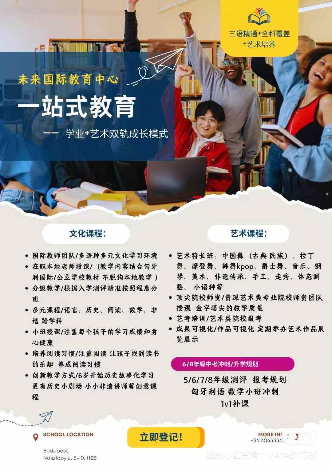 全天课程设置分为语言类(中文、英语、匈牙利语),数学类(系统数学训练,含奥数思维)、阅读课(三语书籍阅读)、历史课(匈牙利历史、中国历史)、艺术课(每日下午1节,手工/绘画/黏土/舞蹈/音乐/非遗文化)。