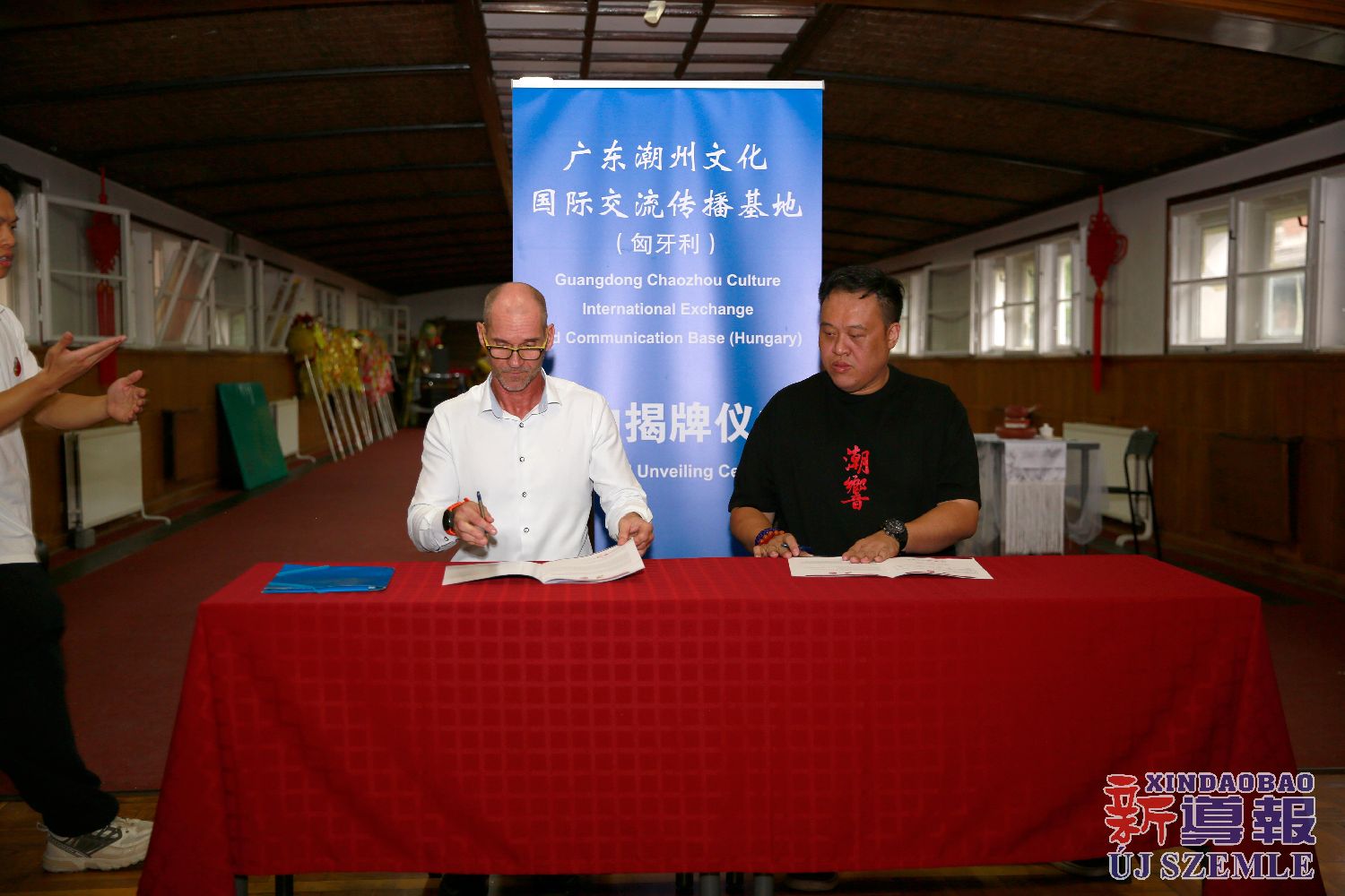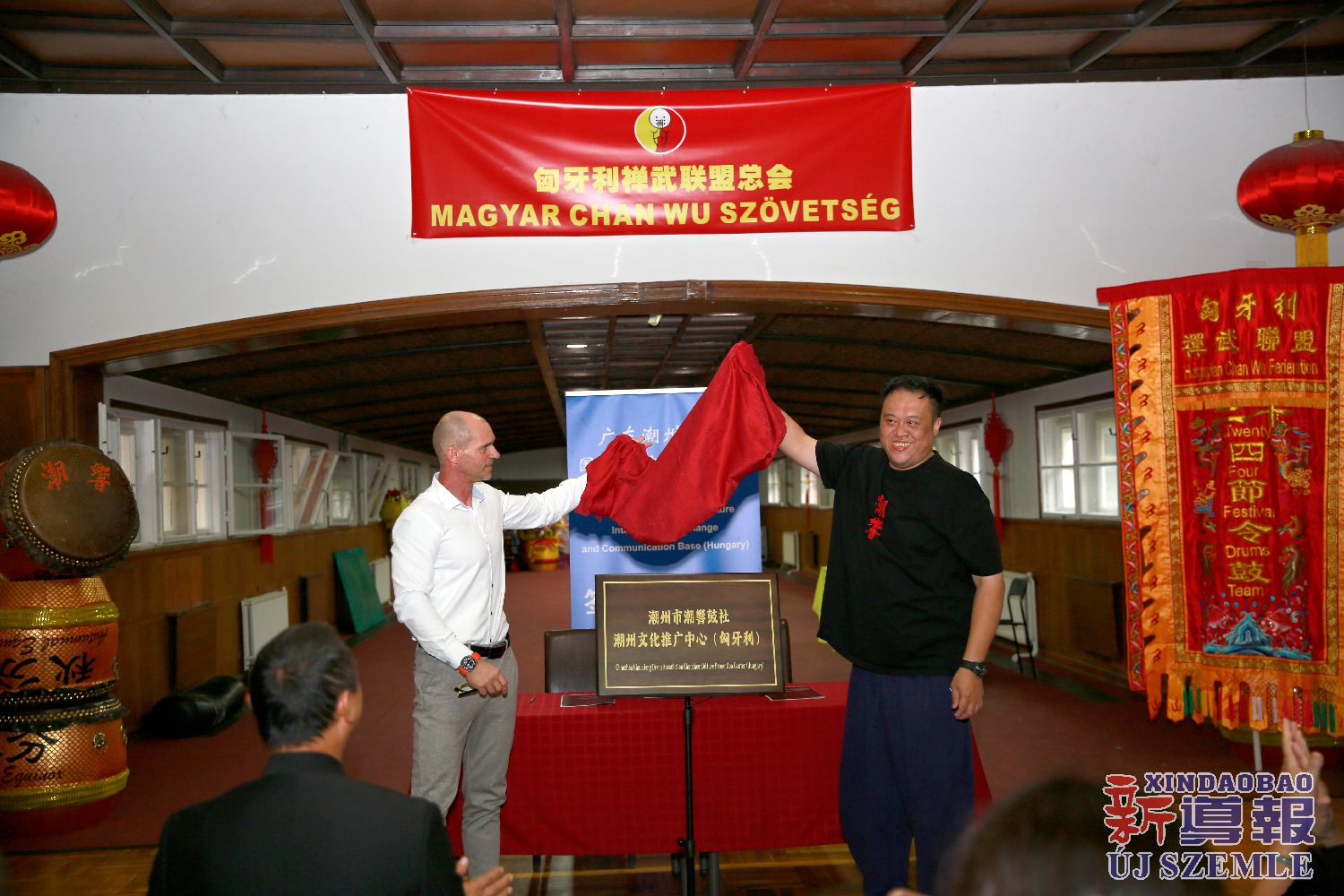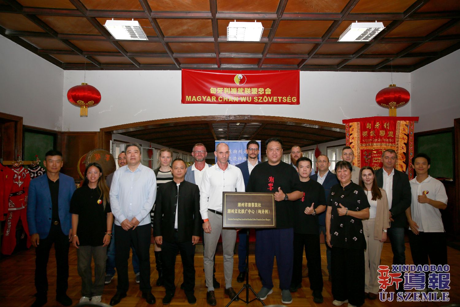 新导报讯:2025年9月14日,位于布达佩斯的匈牙利禅武文化中心内,伴着潮州二十四节令鼓声与潮州英歌舞的飒爽英姿,来自中国潮州的潮響鼓社与匈牙利禅武联盟签署合作备忘录,并举行基地揭牌仪式。
