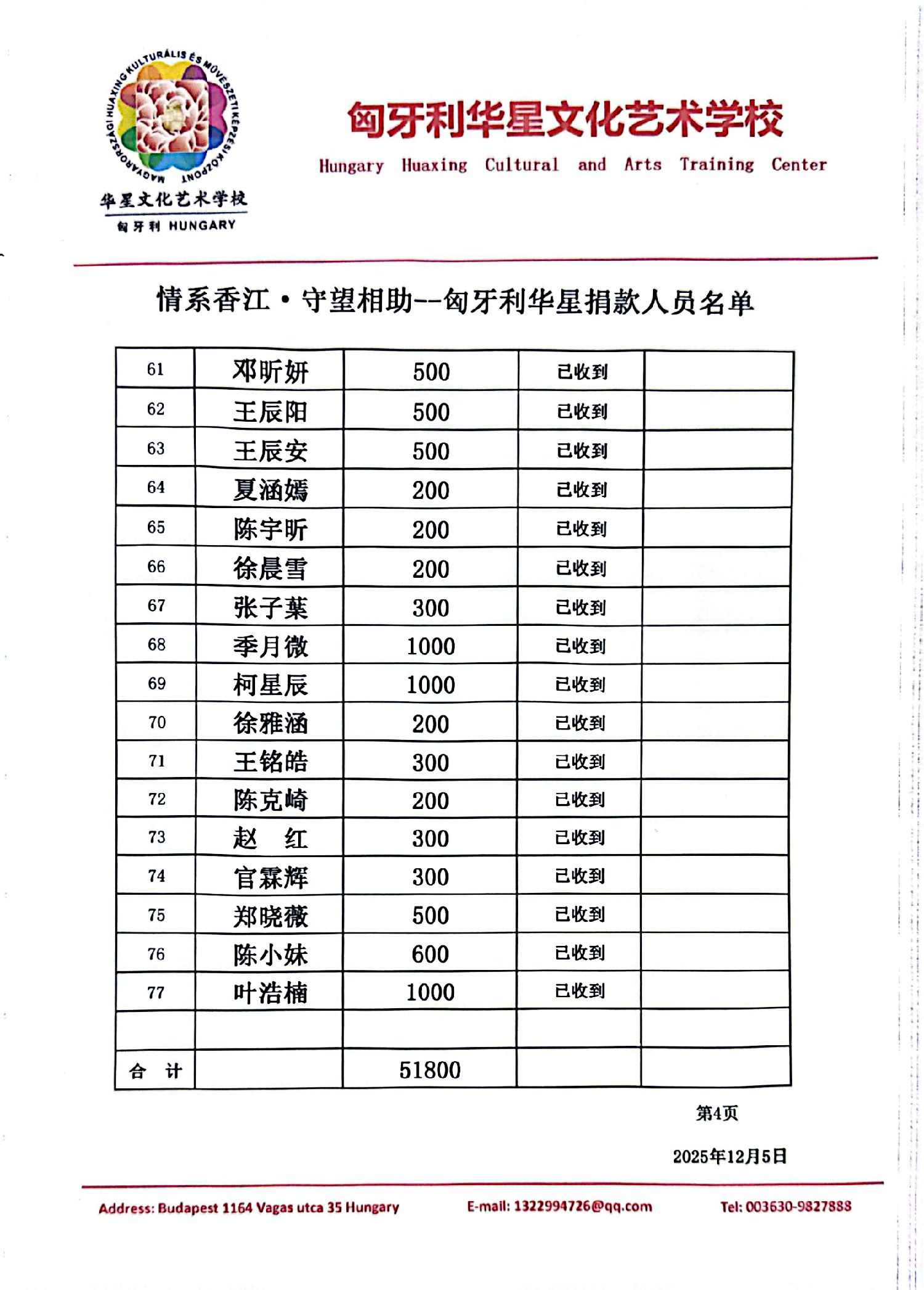 衷心感谢全体华星人的倾情奉献。截至12月6日,匈牙利华星累计募得善款51800元人民币,这笔善款将全数汇至大使馆指定账户,专款用于香港大埔宏福苑火灾受灾群众的安置工作。涓涓细流汇聚成海,点点星光点亮希望,华星想对每一位献出爱心的师生与家长道一声感谢:因为有你们,世界更添温暖,也愿每一位心怀善意的人都被岁月温柔以待。