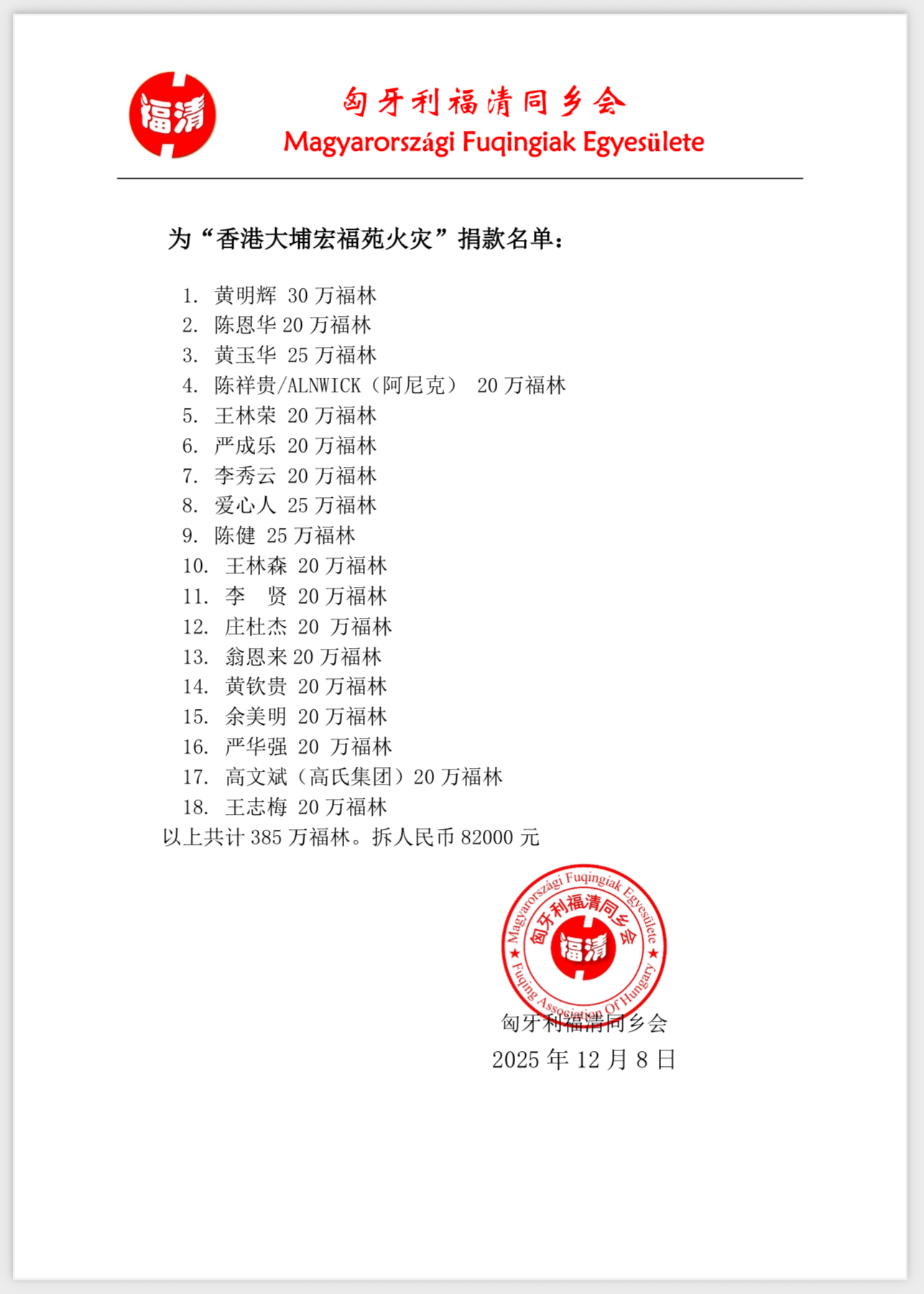 新导报讯:近日,匈牙利福清同乡会发起为香港大埔宏福苑火灾救援捐款行动。截至2025年12月8日,在同乡会内募集了总计折合人民币82000元善款,将通过相应渠道汇至香港,为为受大埔火灾影响居民提供支援。
