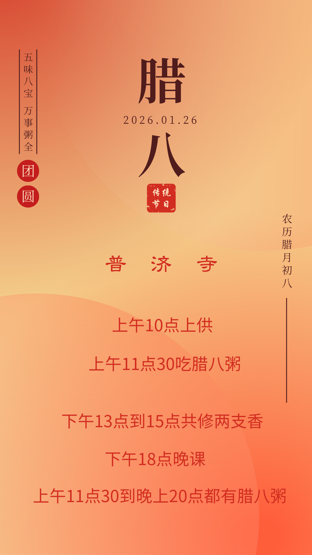 腊八暖寒冬寺院粥飘香过了腊八就是年腊八是佛陀在菩提树下成道的日子也是佛教盛大的节日之一在这一天寺院熬粥供佛与众结缘已成为常仪而喝上一碗寺院熬制的腊八粥也成了许多善信辞旧迎新祈福迎祥不可或缺的环节腊八将至,为“纪念佛陀、感恩众生、祈福天下、广结善缘”,普济寺于2026年1月26日(农历腊月初八),隆重举行“腊八施粥”活动”。以佛教特有的形式,向社会大众免费奉赠腊八粥,以期同沾法喜,共沐祯祥!