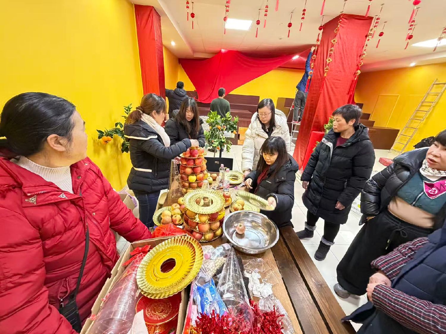 大家分工明确、细致张罗,有的负责搭建法台、布置会场,有的专心组装横幅、悬挂彩旗,还有的认真整理法器、备齐供品,同时细致做好现场引导、秩序维护与餐饮保障等工作。从场地布置到物资准备,从流程衔接到细节落实,每一个环节都凝聚着义工们的默默付出与辛勤汗水。
