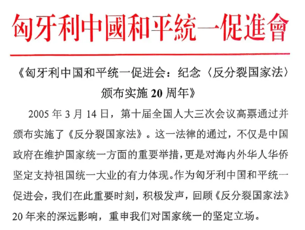 【匈牙利中国和平统一促进会】纪念《反分裂国家法》颁布实施20周年