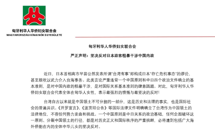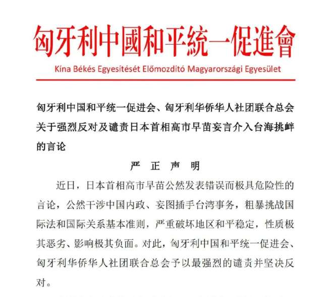 11月18日,匈牙利中国和平统一促进会、匈牙利华侨华人社团联合总会发表关于强烈反对及谴责日本首相高市早苗妄言介入台海挑衅的言论严正声明。
