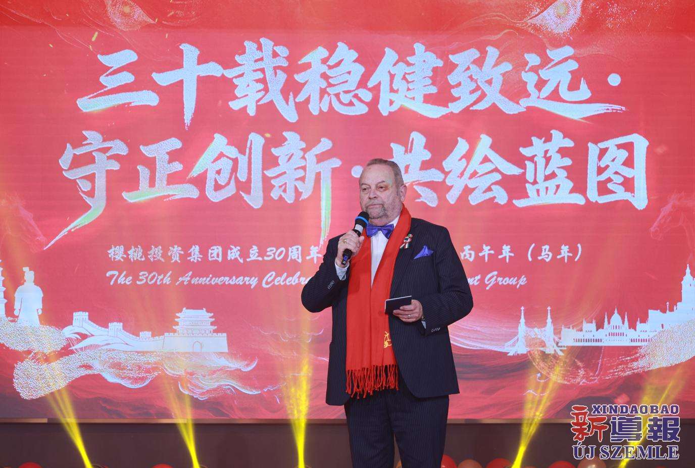 匈牙利樱桃投资集团董事长曹正银致辞说,2026年初春,樱桃投资集团迎来成立30周年。经过三十年发展,集团在匈牙利已形成涵盖餐饮、教育合作、物流和基础设施等领域的业务体系。