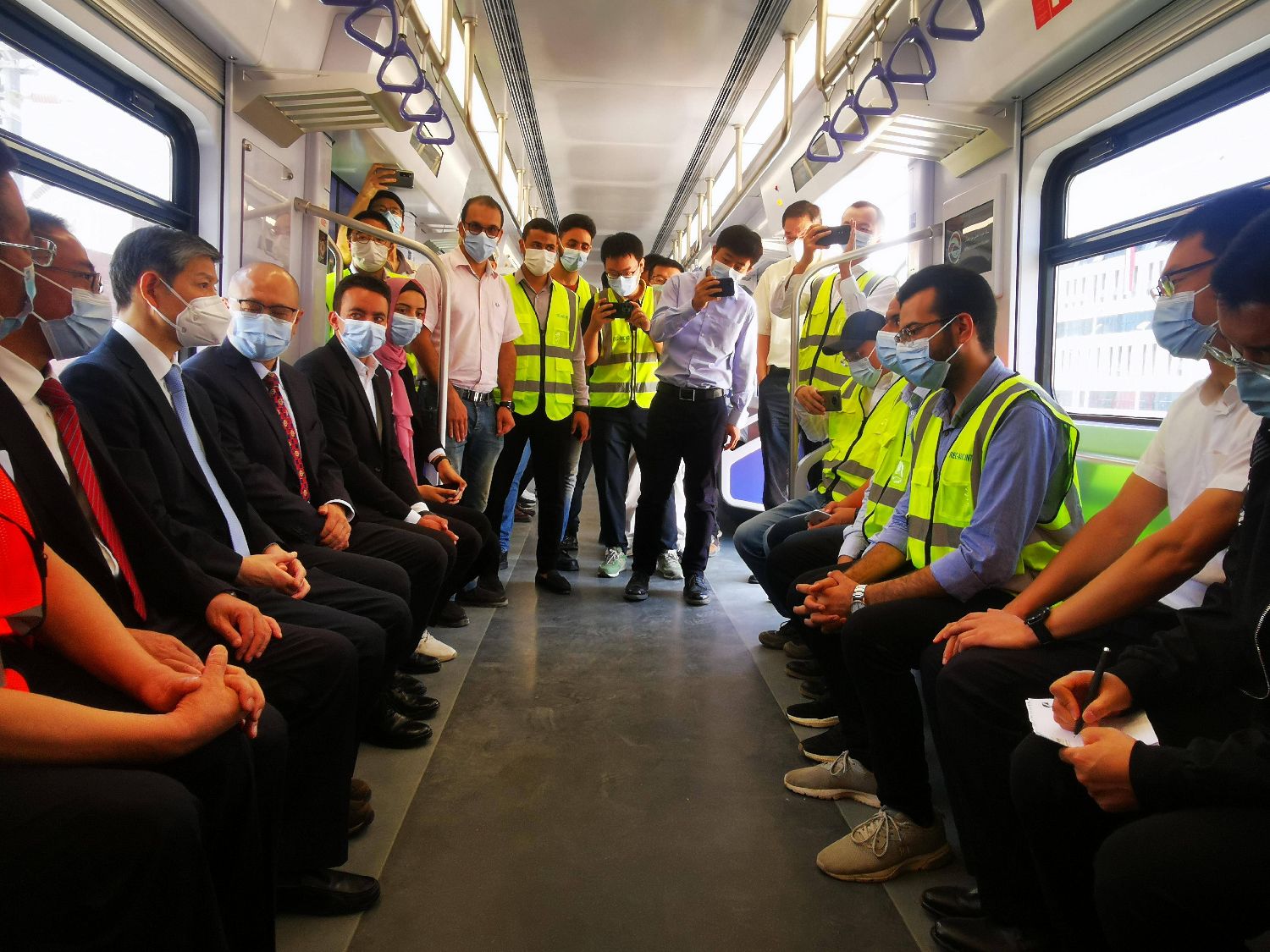 当日试运行的电动车组,是埃及的首批市域电动车组。该车设计最高时速120公里,每列车6节编组,最多可载客2222人,由中车青岛四方股份公司根据当地运营环境为埃及“量身定制”,是技术先进、环境适应能力强大、设计人性化的现代化电动客车,整车性能达到国际先进水平。