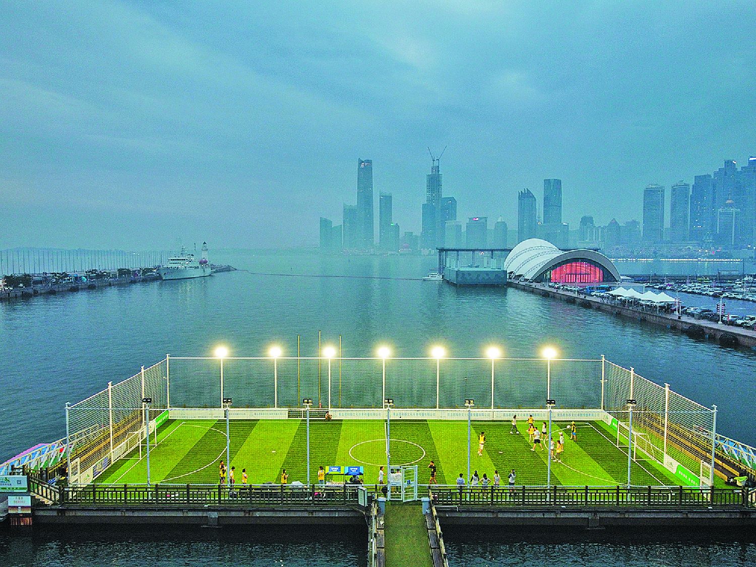 顺应“夜健身”新趋势,今年,青岛市在新建体育公园、笼式多功能运动场时,特别加入了灯光等辅助设施。(张羽)