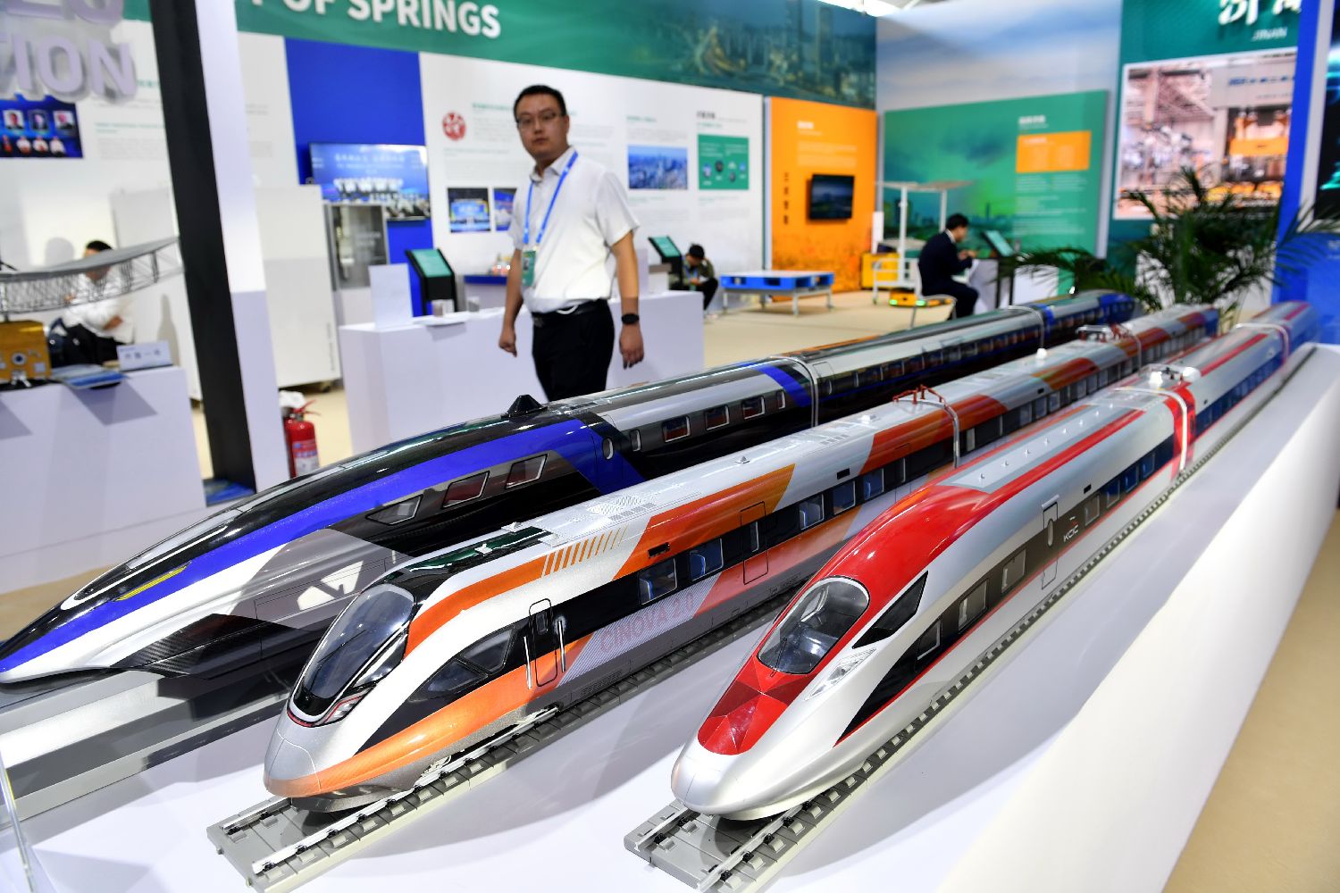 跨国公司与中国主题展青岛展区展出的“青岛造”雅万高铁动车组等模型
