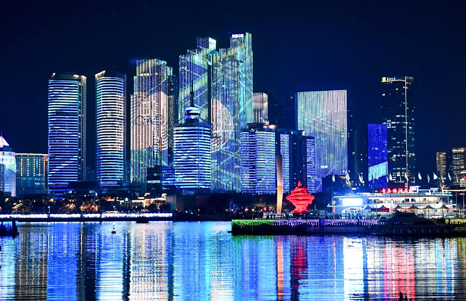 10月11日,青岛浮山湾灯光秀点亮跨国公司领导人青岛峰会标识