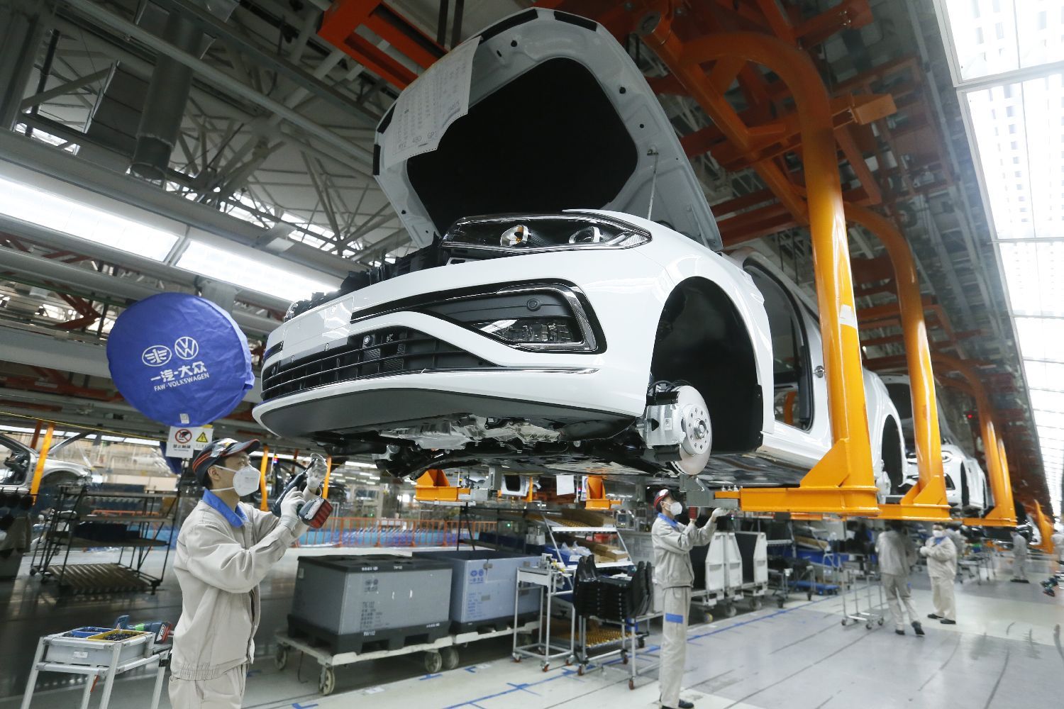 一汽-大众青岛分公司的工人在装配汽车 李涛 摄