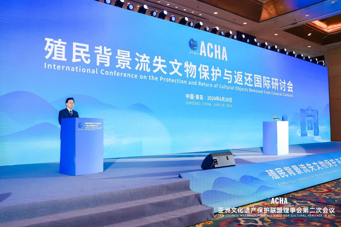 次日,亚洲文化遗产保护联盟理事会第二次会议配套活动“殖民背景流失文物保护与返还国际研讨会”在青岛召开。研讨会发布了成果文件《关于保护和返还殖民背景下流失或通过其他非正义、非道德方式获取之文物的青岛建议书》。《青岛建议书》鼓励加强对话沟通,开展互动合作,就探索解决此类文物的保护与返还问题,提供公正、科学与可持续的方案。这是我国继2014年主导发布《关于保护和返还非法出境的被盗掘文化财产的敦煌宣言》后,再度在流失文物追索返还领域发出中国声音,为推动历史上流失文物的保护与返还创造有利的国际环境。
