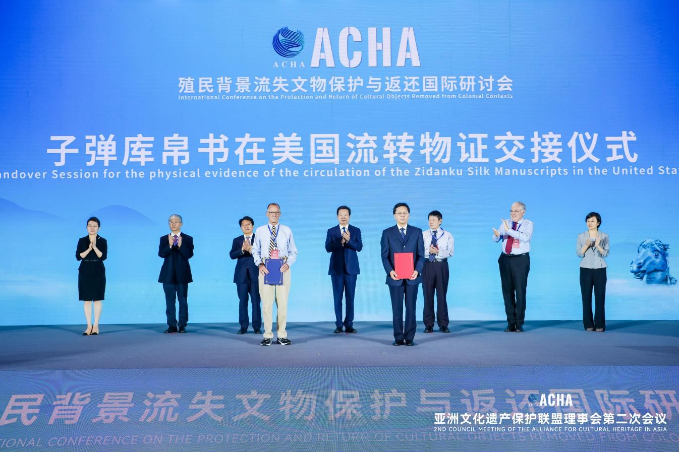 会上,美国芝加哥大学夏德安教授将该校图书馆收藏的长沙子弹库战国楚帛书第二卷和第三卷在美国流转物证移交国家文物局。