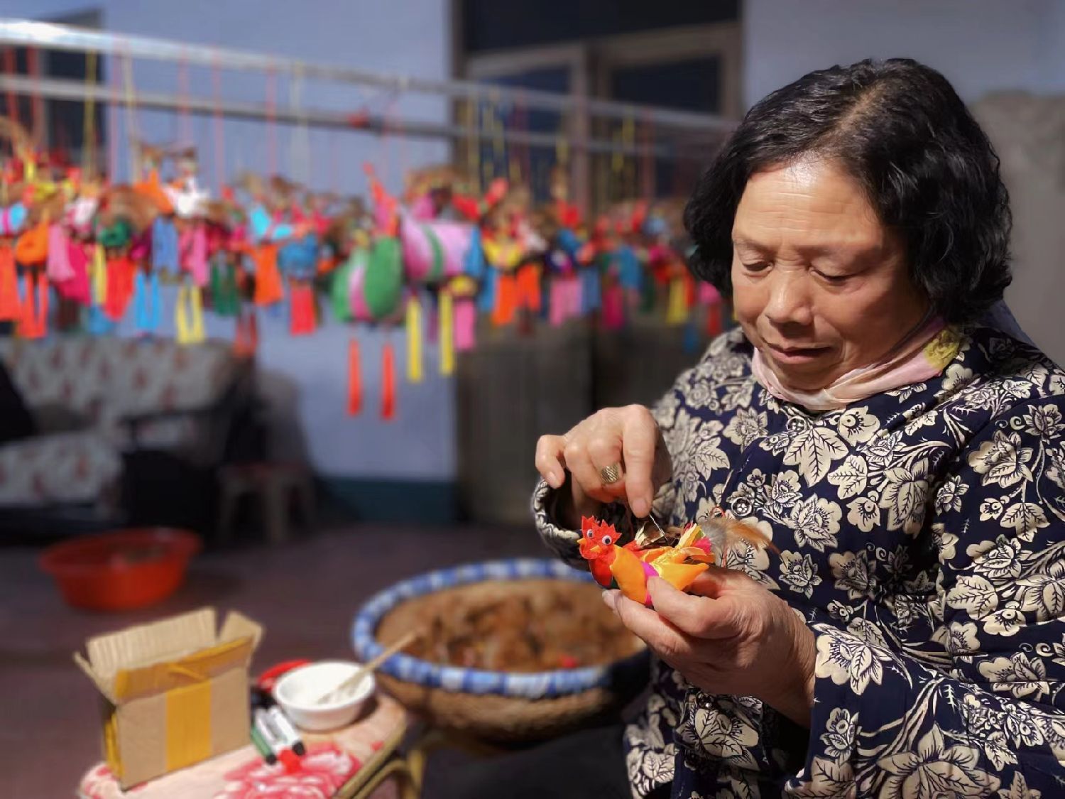 Ren Zhenlan skillfully transforms scraps of fabric into colorful spring chickens,earning praises from everyone who sees them."I learned to sew spring chickens from my mother when I was young.Everyone knew how to do it back then,but now there are fewer people who can sew them.I feel that we must preserve the traditions left by our ancestors,"says Ren Zhenlan,who is now68years old.She not only sews spring chickens for her own children every year but also gifts them to the children of her neighbors and relatives.