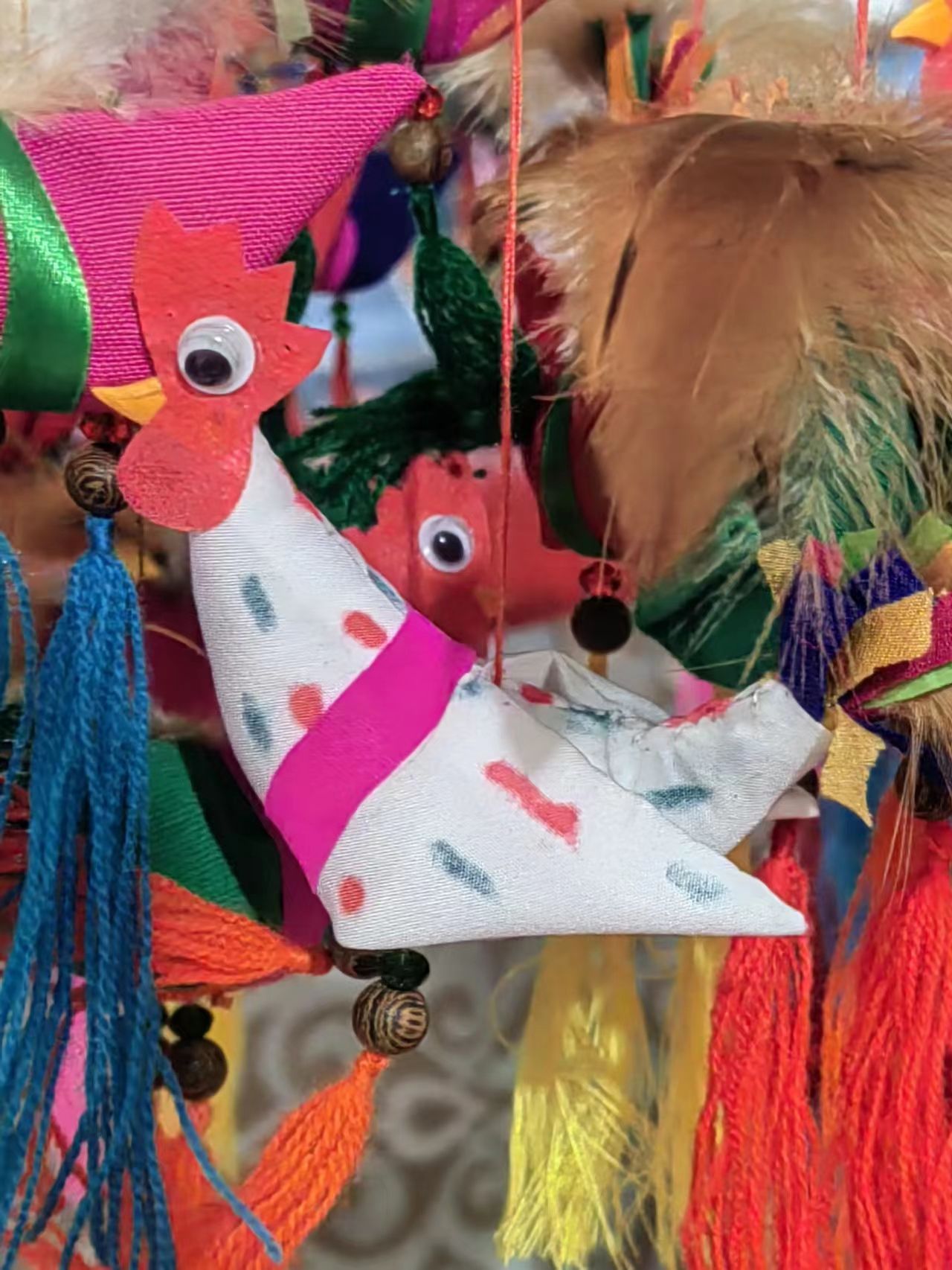 Ren Zhenlan not only adheres to the old traditions in sewing spring chickens but also innovates new sewing techniques.She has made several improvements to the craftsmanship of spring chickens:firstly,by adding a pair of wings to make them more lifelike;secondly,by separately sewing the beaks of the chickens instead of cutting them out together with the crest,as the traditional method often resulted in soft beaks that deformed easily.Ren Zhenlan found yellow fabric,cut and folded it,used starch to stiffen it,and then let it dry,creating a pointed yellow beak.Thirdly,she uses real chicken feathers for the tails of the chickens,which she collects from her brother's chicken farm.After washing and drying them,she attaches them to the chickens'bodies.With their tails held high,the chickens look lively and spirited.