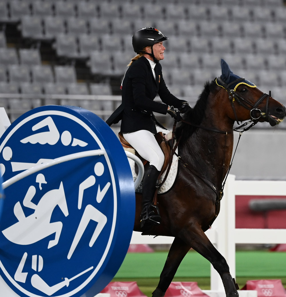8月6日,东京奥运会现代五项比赛上,一度领先的德国选手施洛伊在赛马失控后悲伤落泪。图/新华社