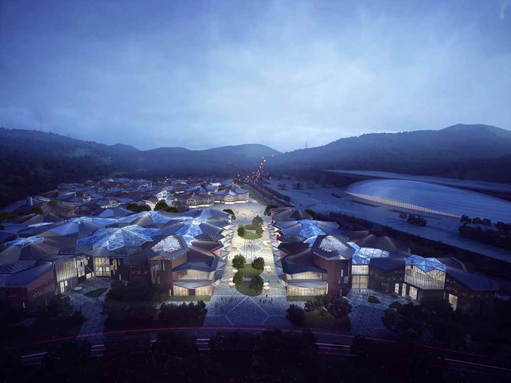 二是服务于小镇生活配套的文创商街组团,提供开放式商业街区、精品民宿酒店、各具风情的餐饮酒吧等,并搭配大型沉浸式体验展览。冬奥颁奖广场也坐落于文创商街组团。