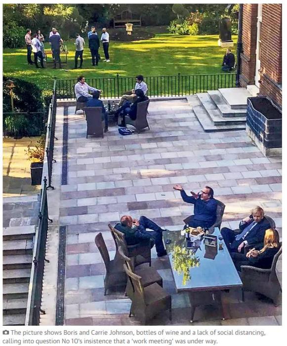 英国《卫报》刊登了一张英国首相约翰逊在2020年5月在首相官邸唐宁街10号聚会的照片,指其涉嫌违反防疫规定。(图片来源:英国《卫报》报道截图)