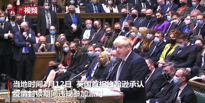 当地时间1月12日,英国首相约翰逊在议会承认举办违规聚会,就此道歉。(图片来源:中新视频截图。)