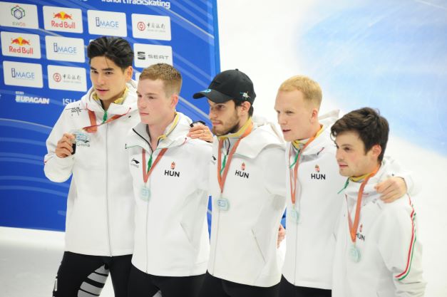 刘少林(左一)与队友们在匈牙利德布勒森市2021赛季短道速滑世界杯第三站比赛中领奖。摄影:新导报记者 文采