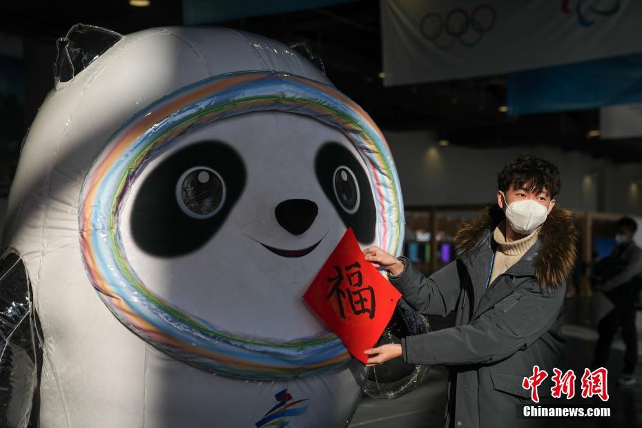 1月31日,一名工作人员在现场手持福字与“冰墩墩”合影。当日,北京冬奥会主媒体中心举行活动迎接中国虎年新春到来。中新社记者崔楠摄