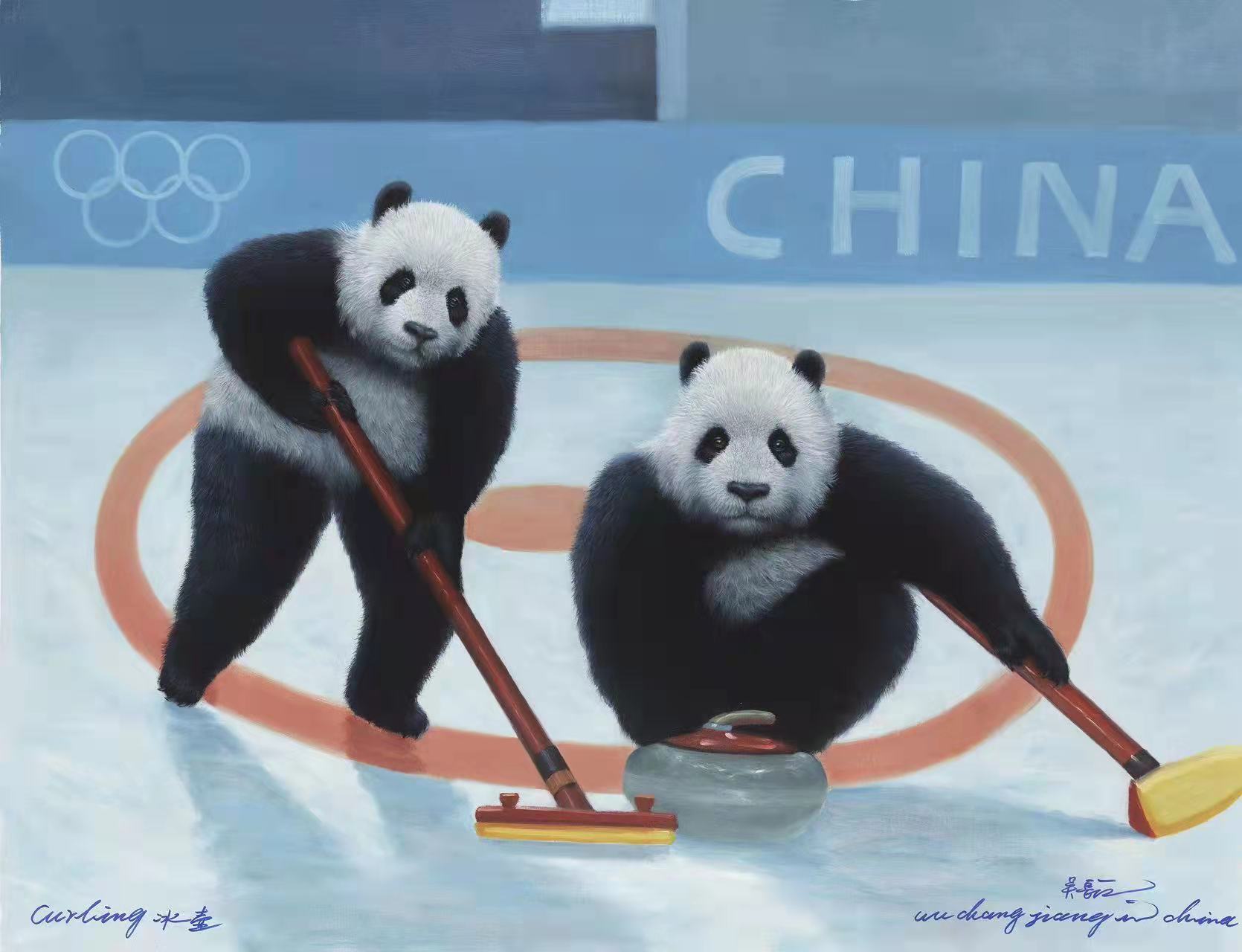 Among Wu's twelve snow panda works,each represents a sport of the Winter Olympics.When giant pandas ski,ice-skate,slide curling,play ice hockey,and do other activities,the level of their adorability skyrocketed.Some art critics said that these works will explain and promote a more excellent culture that contains Chinese traits,demonstrates Chinese spirit,and holds Chinese intelligence,creating a trustable,loveable,and respectable Chinese image."In the recent years,Mr.Wu Changjiang's giant panda works have been recognized as a special cultural symbol,evoking an emotional empathy around the world.