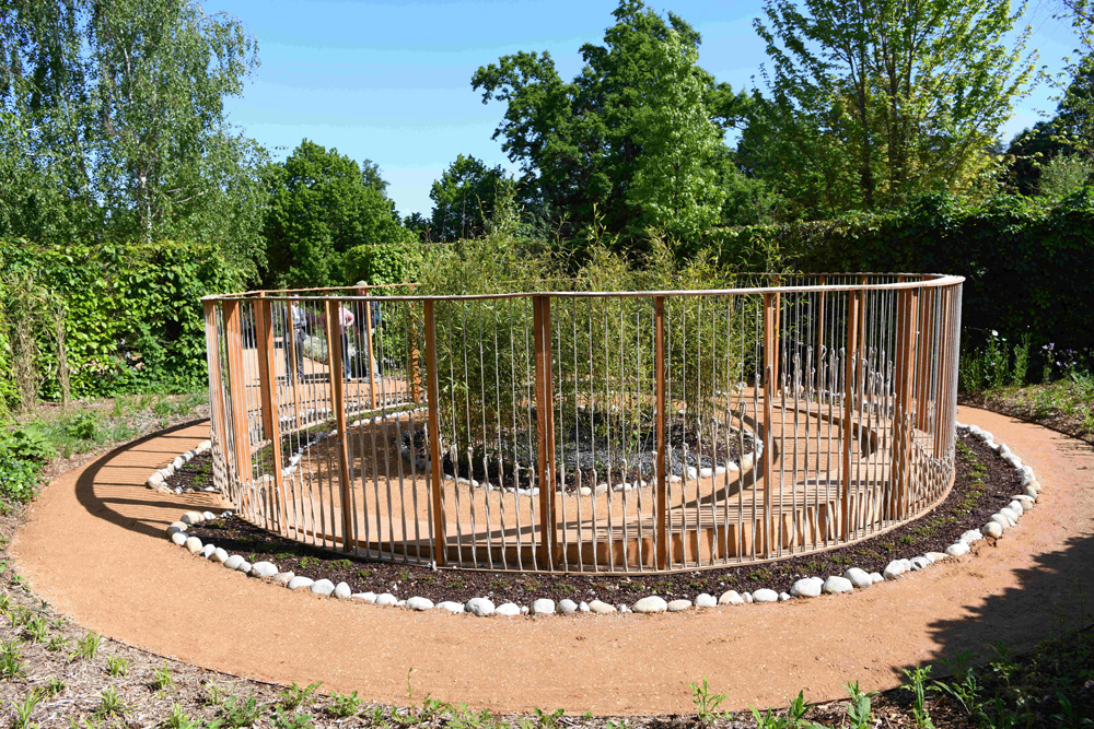刘相诚:“幻之园”由三个同心圆构成,外圆环用绳索构成绵延的山峦意向,取自中国南宋末年画家牧溪的传统山水画《潇湘八景图》中“平远山水”笔法;中圆环种植竹子,幽篁疏影为游人提供行吟游心之地;内圆环用反光石子表达水的意向,增添光影和灵动的“幻境”之感。