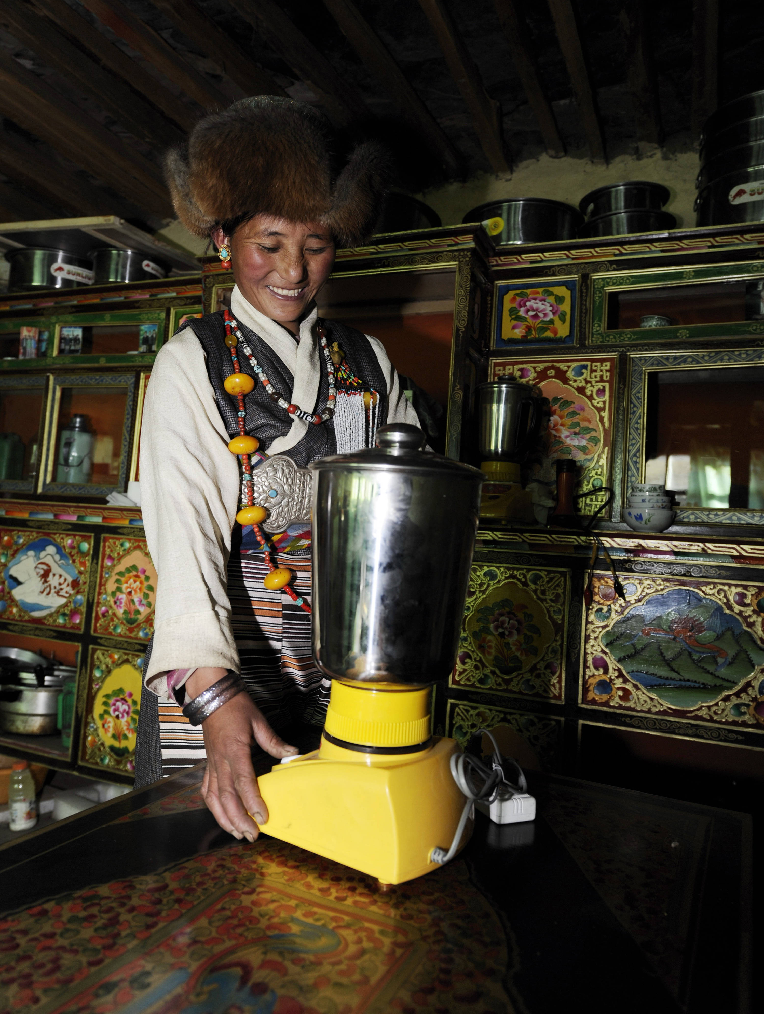 2011年12月12日,西藏日喀则拉孜县吉角村村民仓决用电动酥油茶搅拌机给家人打酥油茶。图/新华社