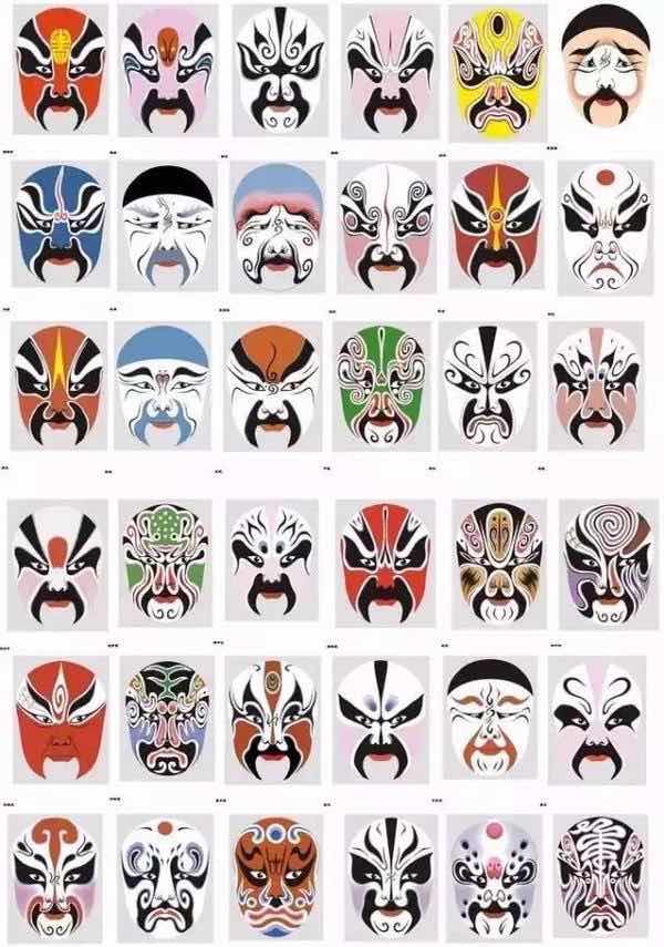 脸谱的色彩运用有一定的内容和含义,它是表现人物性格的主要因素。红色:象征忠勇、正义、威武、庄严,大多用于富有血性的人物。如关羽。紫色:表现骁勇、刚毅、正直、坚强、胆大。如杨延昭。黑色:表现公正无私的,如包公;表现暴躁、鲁莽、耿直的,如张飞等。脸谱图案的四种基本类型是揉,勾,抹,破。揉脸:用手指将颜色揉满面部,再加重眉、目、面纹的描画,是象征性脸谱,最具有代表性的是关羽的揉红脸,是按照关羽传说重的面如重枣,卧蚕眉,丹凤眼的面貌设计的。揉黑脸,如《叭蜡庙》的金大力。勾脸:用毛笔蘸颜色勾画眉、目、面纹,填充脸膛主色,组成彩色图案,有的贴金敷银,五光十色,是一种指示性脸谱,张飞在剧中勾黑色脸,环眉,环眼,表示传说中的豹头环眼。抹脸:抹脸是用毛笔蘸水合白粉,把脸的全部或一部分涂抹成白色,表示这类人物不以真面目示人,是一种饰伪性脸谱,又称粉脸,如曹操在京剧中是大奸雄,是大粉脸,满面涂白破脸:京剧脸谱一般眉、目、面纹左右对称,也有少数谱式两侧图形不对称,称为破脸,是一种贬斥性脸谱,用破脸的人物或相貌丑陋,或性情凶残,如《斩黄袍》中的郑子明,传说他相貌丑陋,《法门寺》中的刘彪,表示他为杀人凶犯,《白绫记》的李七。