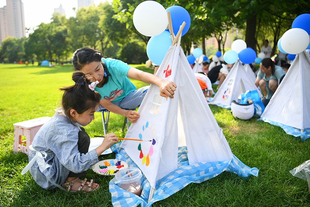 在山西太原,家长与孩子共同绘制帐篷涂鸦,享受假期时光。图/中新社