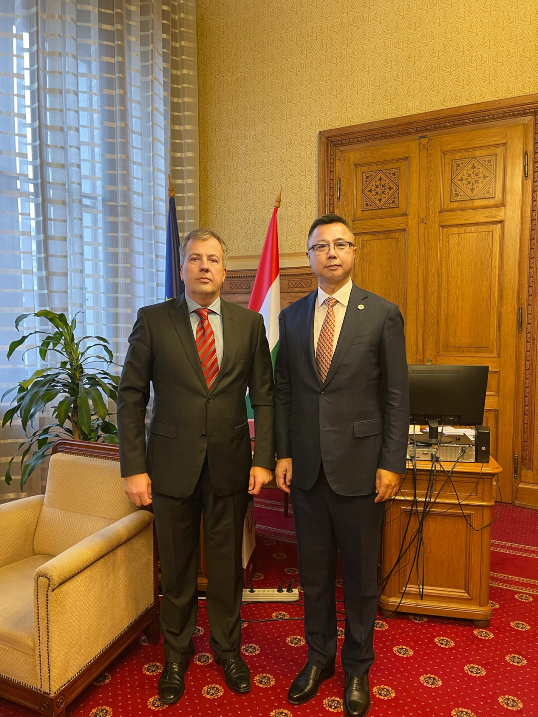 当日下午,潘锋率队在匈牙利国会大厦拜会匈牙利国家议会副主席欧拉·劳约什,双方就中匈经贸关系、筹备成立欧中工商理事会、共同推动中国企业落地投资、文化旅游、教育等领域深化合作、第二届中欧地理标志协定论坛等议题相互交换意见。