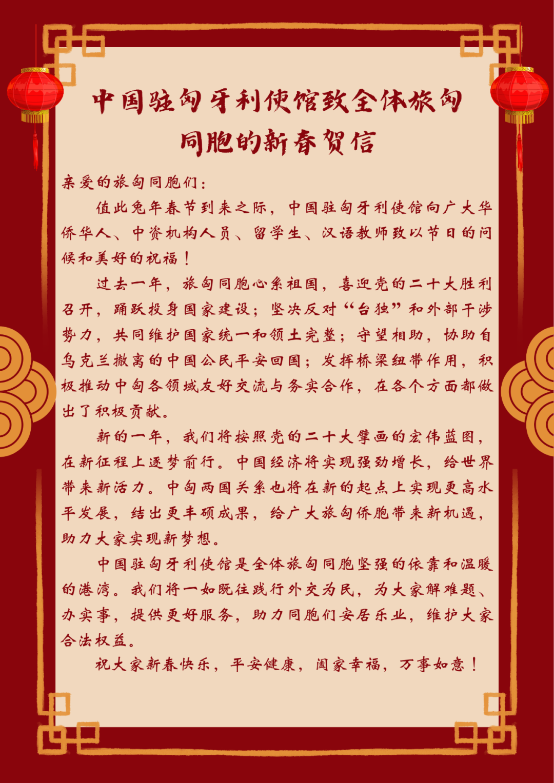 中国驻匈牙利使馆致全体旅匈同胞的春节贺信