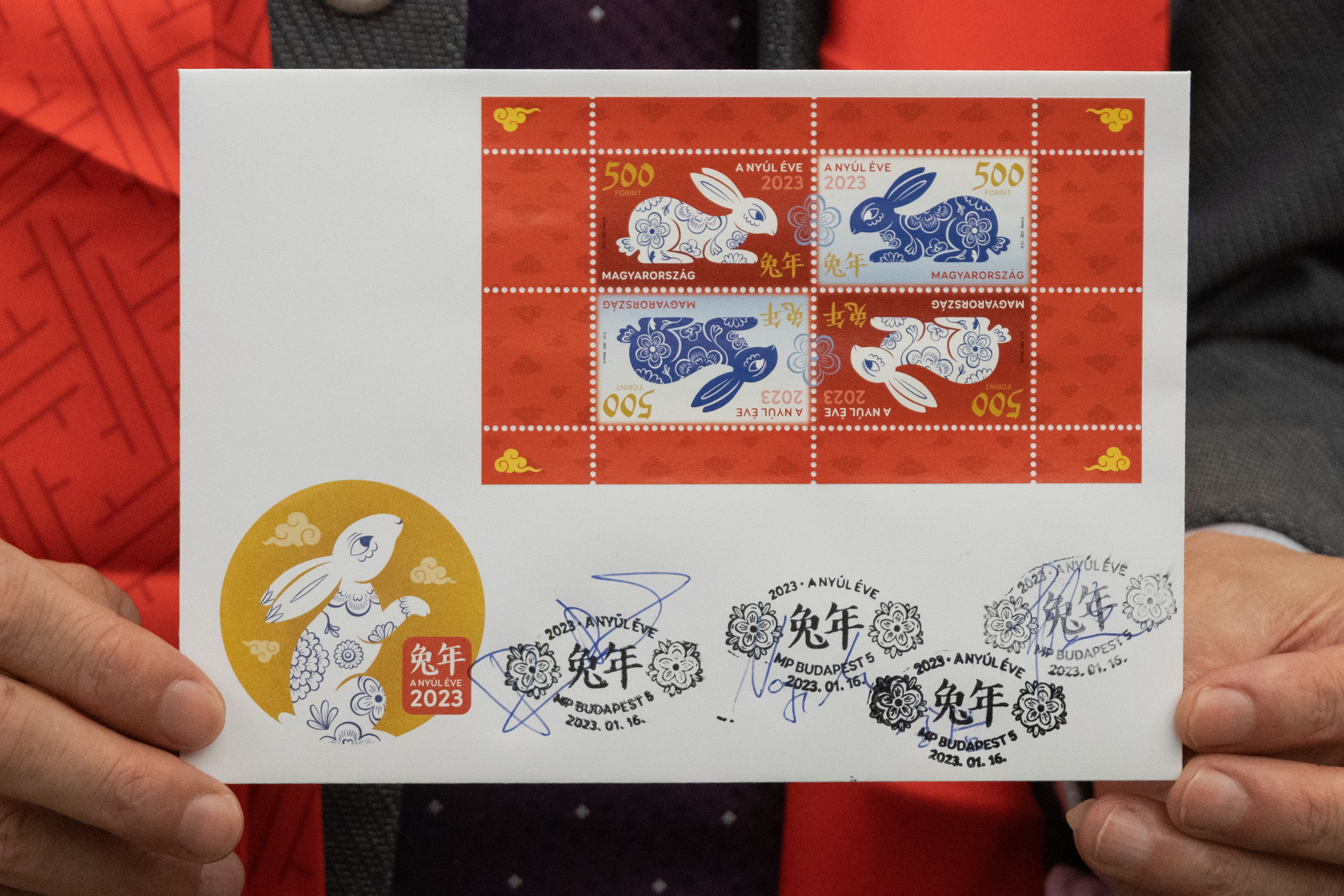 这是1月16日在位于布达佩斯的匈牙利邮票博物馆拍摄的中国农历兔年生肖邮票首日封。图/新华社