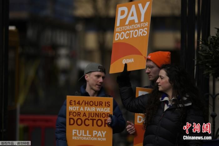 2023年3月14日,英国的初级医生在伦敦圣玛丽医院外举着标牌举行罢工活动。