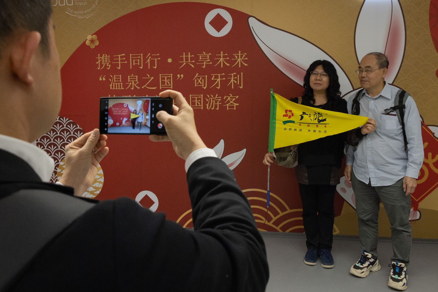3月26日,中国游客抵达匈牙利布达佩斯机场后拍照留念。图/新华社