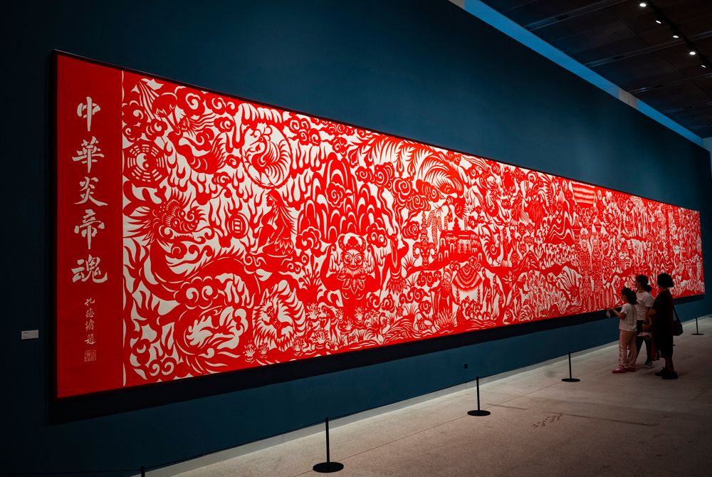 2022年7月2日,“太行之魂——张永忠剪纸艺术作品捐赠展”在位于北京的中国工艺美术馆、中国非物质文化遗产馆开展,展览展出山西艺术家张永忠先生的400余件(套)剪纸作品,展现中国北方尤其是山西多地质朴、简练的民间剪纸艺术风格。图为观众驻足欣赏长22米、高3米的巨幅作品《中华炎帝魂》。图/中新社