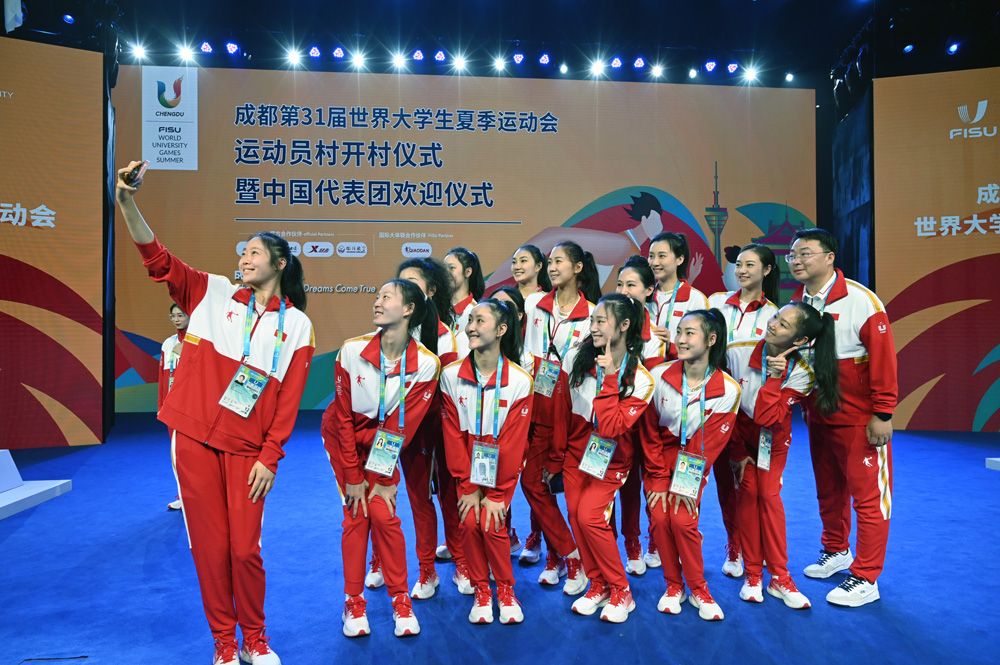 7月22日,成都第31届世界大学生夏季运动会运动员村正式开村,并为首支入住的代表团——中国大学生体育代表团举行了欢迎仪式。图为成都大运会中国大学生艺术体操队队员在欢迎仪式现场拍照留念。图/中新社